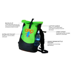Features laptop sleeve, extra zip pocket, chest strap and drinks bottle holder (water bottle not included).