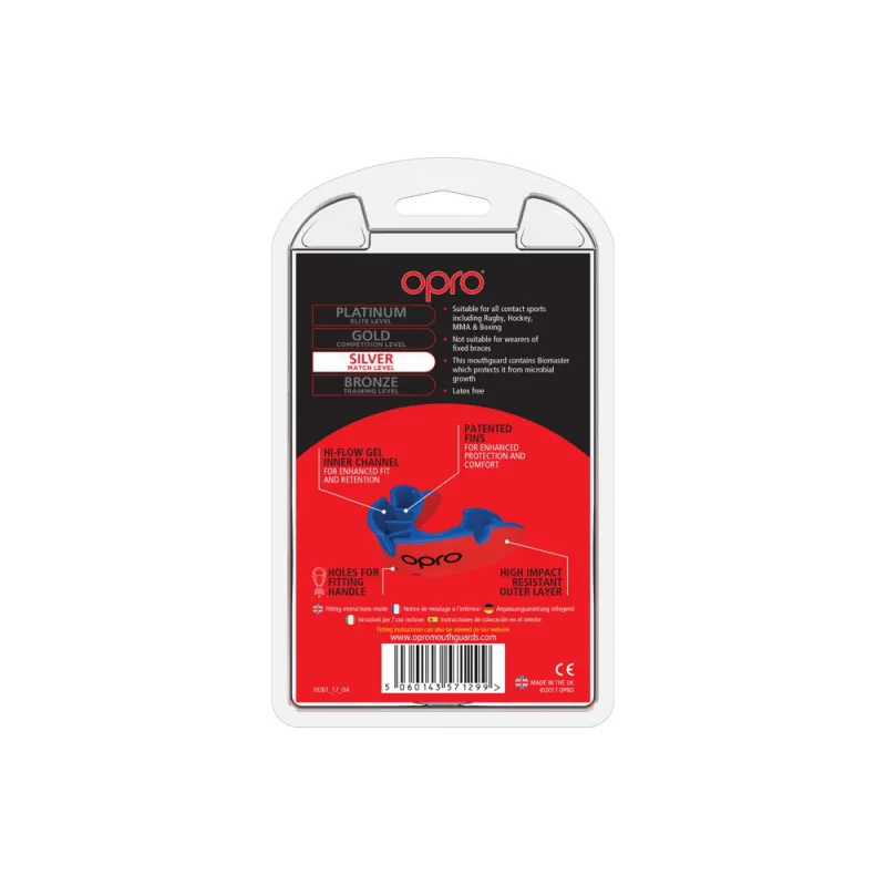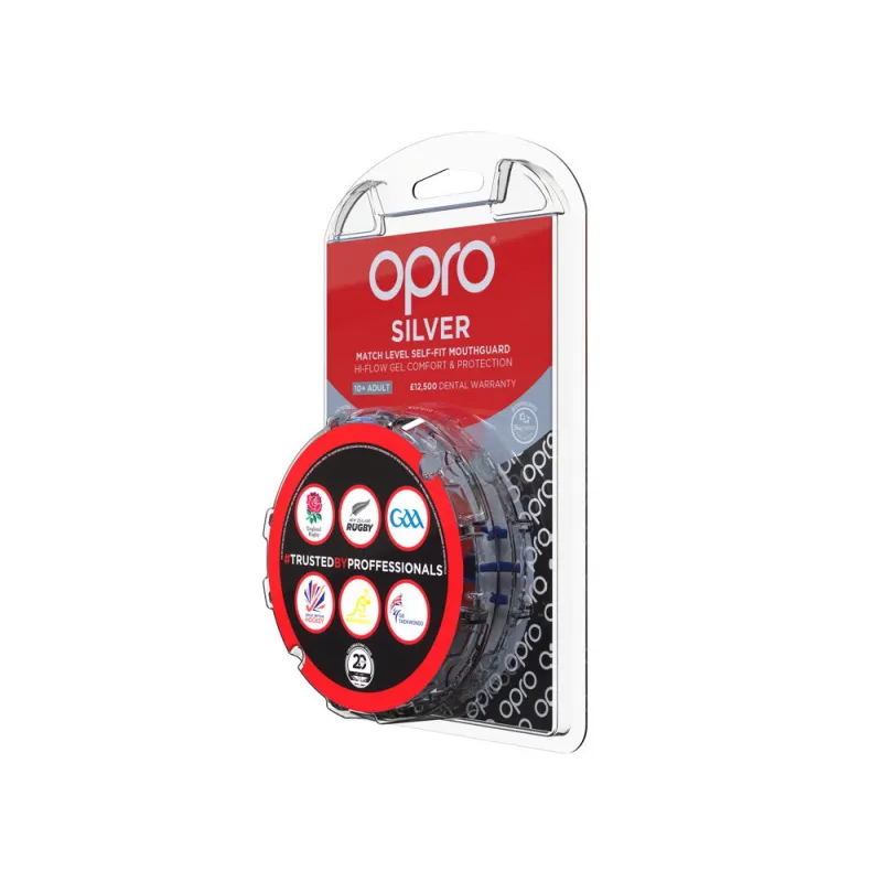 The durable outer layer of the dual layer Match Level Silver Self-Fit mouthguard from OPRO provides enhanced impact protection.